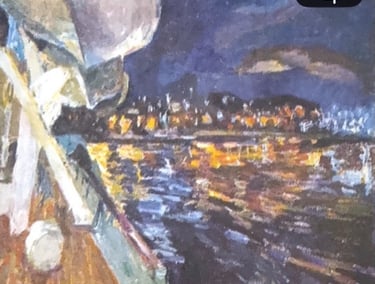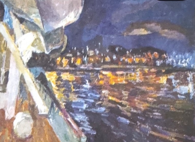Plakhova y Alekseev saben crear la ilusión de infinitud, de una cierta “desmesura” cuando la visión de repente rebasa los límites del cuadro, como si se saliera del marco y se convirtiera ella misma en la mirada del espectador. Es interesante no solo el paisaje marino, sino también el paisaje terrestre, que surge ante los pintores como si fuera resultado de viajes, igualmente caracterizado por medios pictóricos muy específicos si ocasionalmente así lo requiere la expresión artística. Esto es “Nueva York de noche”, “Los Ángeles desde el avión” de B. Alekseev; “Fuegos de Singapur”, “Desde la cubierta”, “Mañana transparente sobre Singapur” de M. Plakhova. En la luz artificial de las lámparas estos cuadros parecen, en sus brillos matinales y su transparencia aérea, como fantásticos oasis entre el mar. La nitidez, el dinamismo escultórico de los contornos urbanísticos, la suavidad repentina y sedosidad de los colores de la noche, la claridad del dibujo, dan una imagen del puerto moderno industrial, cercado por la belleza natural de su bahía.
