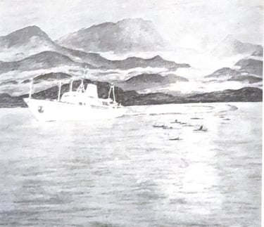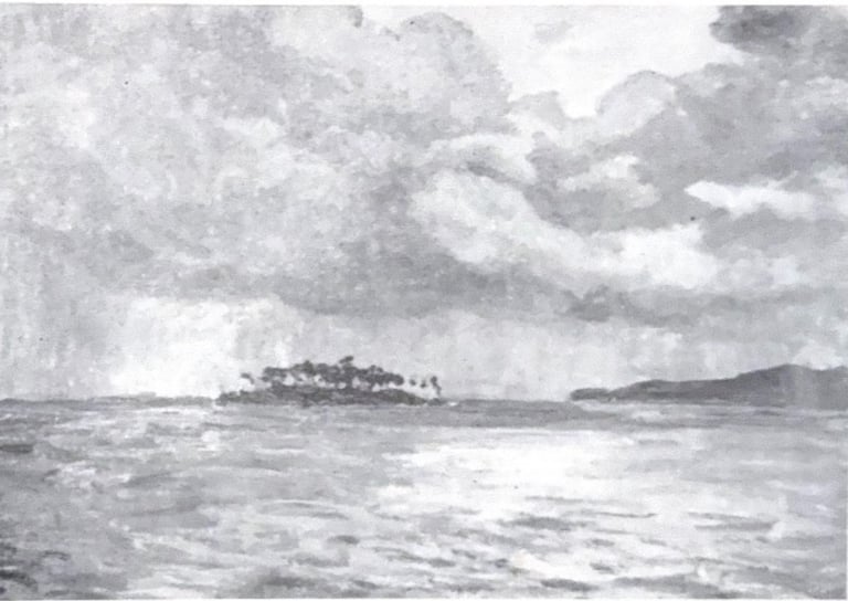 Los paisajes geológicos de los artistas, dedicados a la vida en la rama meridional del Instituto de Oceanología de la Academia de Ciencias de la URSS, fueron incluidos en la exposición no por casualidad: surgían casi directamente del tema al que los artistas decidieron dedicar sus obras. A propósito, sobre los orígenes de esta añeja fascinación. En 1959, Marina Leonídovna Plakhova asistió a una conferencia de escenografía organizada por la Sociedad Teatral de toda Rusia en Vladivostok. El primer día libre, los anfitriones, encabezados por el director de la sección local de dicha Sociedad, organizaron para los participantes de la conferencia un paseo en lancha. El día estaba soleado y claro. Una pequeña isla, donde desembarcaron los “viajeros”, yacía como colgada en oro. Las olas lanzaban a la orilla pequeñas estrellas marinas y mejillones que parecían perlas. En la distancia, unas islas oscilantes, soleadas también, y muy cerca, las primeras olas acariciaban la arena y las cangrejeras; desprendían un brillo húmedo y, como si fueran sobre una alfombra bordada en un negro azulado, unas hileras de cangrejos correteaban. El encanto de esta primera impresión marina no abandonó más a Marina Plakhova. Y fue más tarde, cuando los artistas se encontraron ya en el trópico, cuando el océano se extendía a lo largo del horizonte, cuando las olas arrastraban perlas negras y rosas, cuando sobre la cubierta con la borda abierta el corazón se estrechaba con esa línea azulina —quedaba claro que el pensamiento del viaje lejano por el océano ya la había conquistado. Fue entonces cuando comenzó el largo camino hacia la aldea de Bongú…
