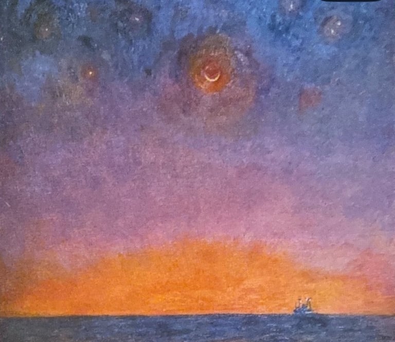 Plakhova resuelve las cuestiones de color, tonalidades, juego de reflejos allá donde es especialmente compleja la tarea son, increíblemente, una nitidez visual, y a veces un temblor marino inquieto, olvidado por la tormenta o azotado localmente por el viento. El océano es mostrado con maestría, en óleos y pasteles arrebatados, con la visión de Plakhova y Alekseev. En “El Pacífico Abierto”, “Tarde de Pastel”, “Minuto antes de la tormenta”, “Atardecer” de B. Alekseev, “Atolón Negro”, “Amanecer”, “Antes del alba” de M. Plakhova —y en muchas otras obras— el artista muestra una familiaridad comprensiva con lo observado. Los autores observan atentamente las cambiantes facciones del océano, tratando de transmitir con la máxima proximidad su estado: desde el resplandor del mediodía, donde la ola es casi inmóvil y transparente, hasta el juego inquieto del crepúsculo, o la sucesión repetida de luces y sombras en el contraste del brillo vespertino con la noche que cae, donde aparecen tonalidades verdosas de agua, tonos flamígeros del atardecer y el tono perla-marfil del amanecer. En estas pinturas surge una analogía con el arduo trabajo del científico: la ciencia del océano se desarrolla para comprender, encontrar y explicar sus misterios biológicos, para desvelar su naturaleza hasta donde sea posible.